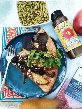 Pour pizza toppings evenly on pizza crust, sprinkle with goat cheese and bake for 5 minutes in oven - remove from oven and let cool for a few minutes, top with a nest of the greens, sprinkle with pepitas and drizzle with Salad Girl's Curry & Fig to taste, cut into pieces and enjoy.