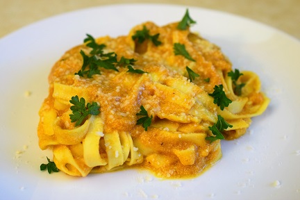 3. Add the half and half, Parmesan, pumpkin, and nutmeg. Stir until the cheese is melted and the sauce is heated through.