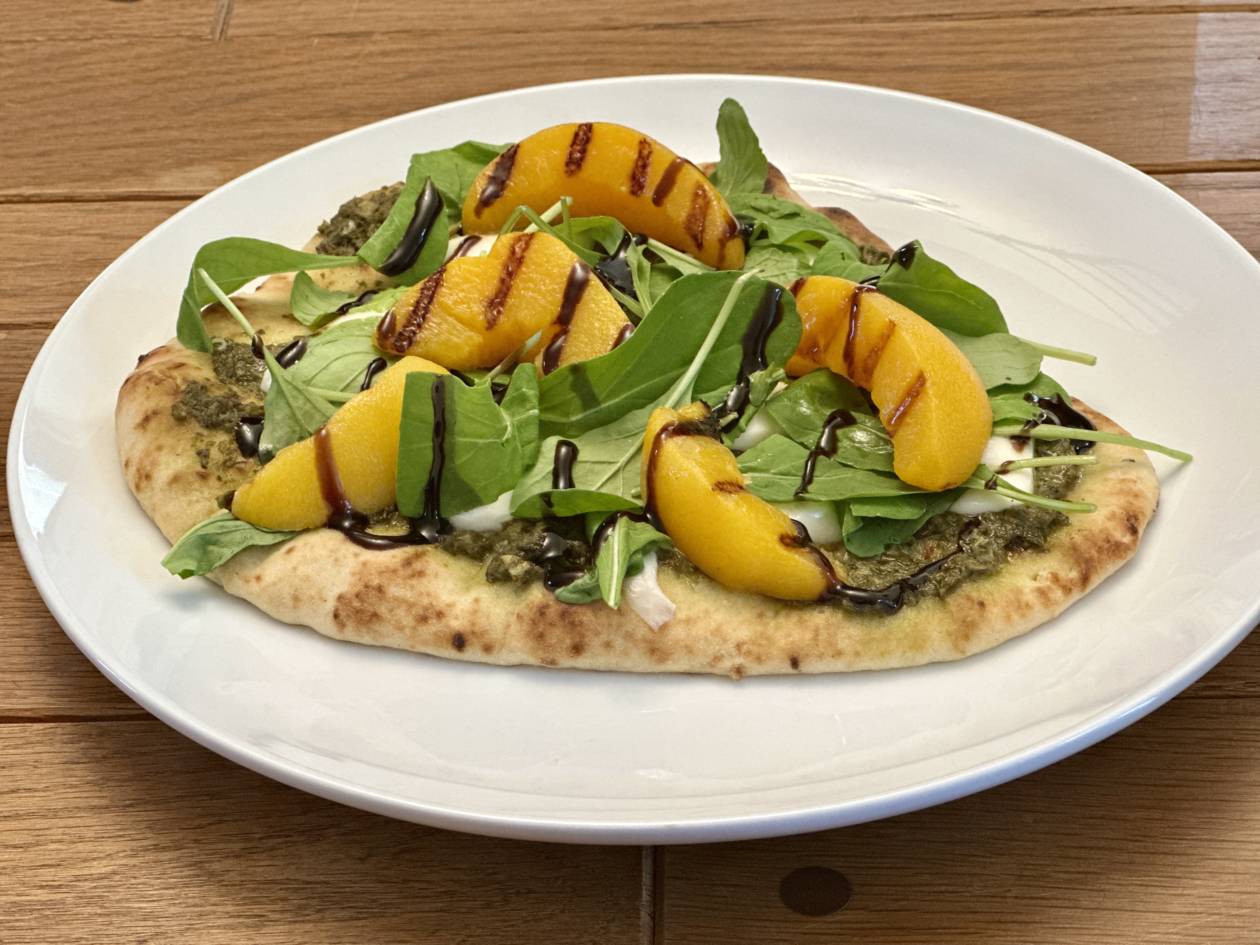 Remove from the oven and top with arugula, grilled peaches, and a drizzle of balsamic glaze. Slice, serve, and enjoy!