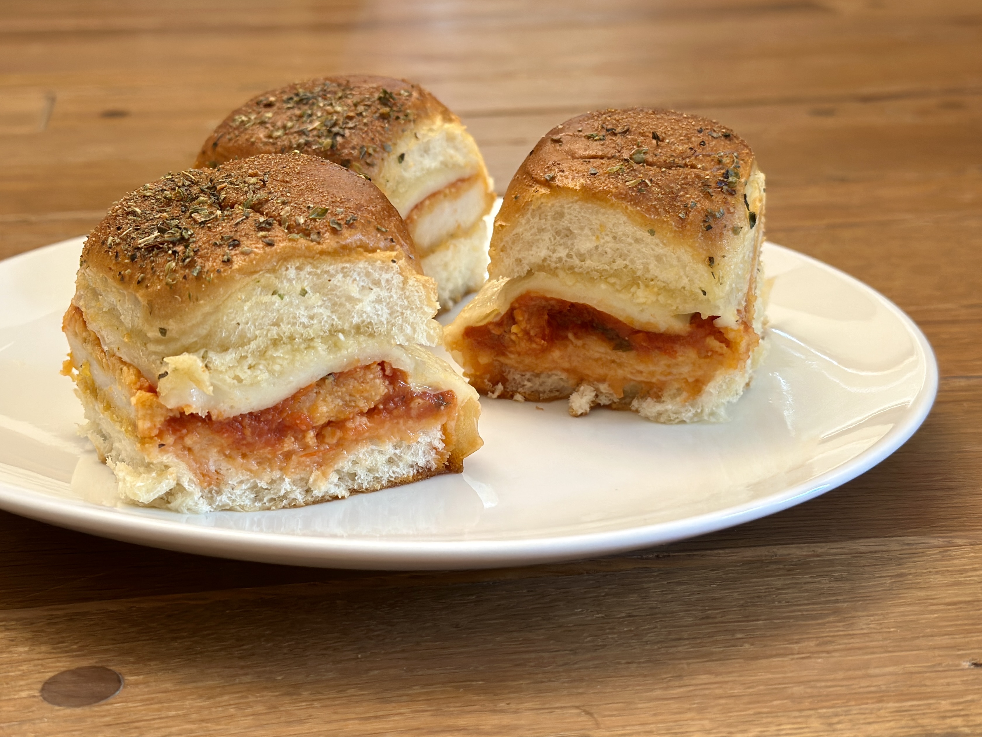 Slice the rolls in half. Place the bottom half in a greased casserole dish.