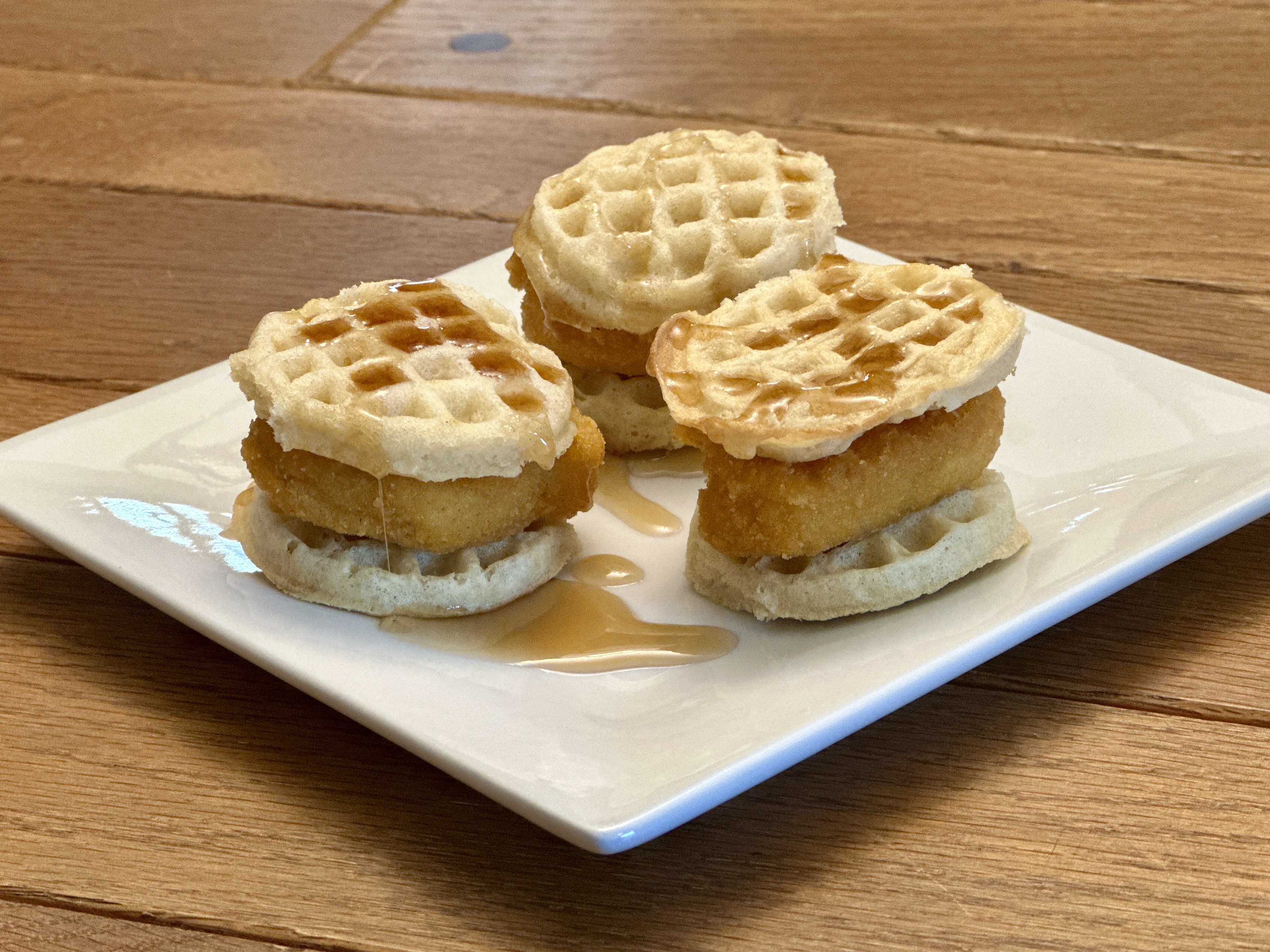 2. Assemble the sliders. One Eggo on the bottom, chicken nugget in the middle, and another Eggo on top. Hold together with a toothpick.