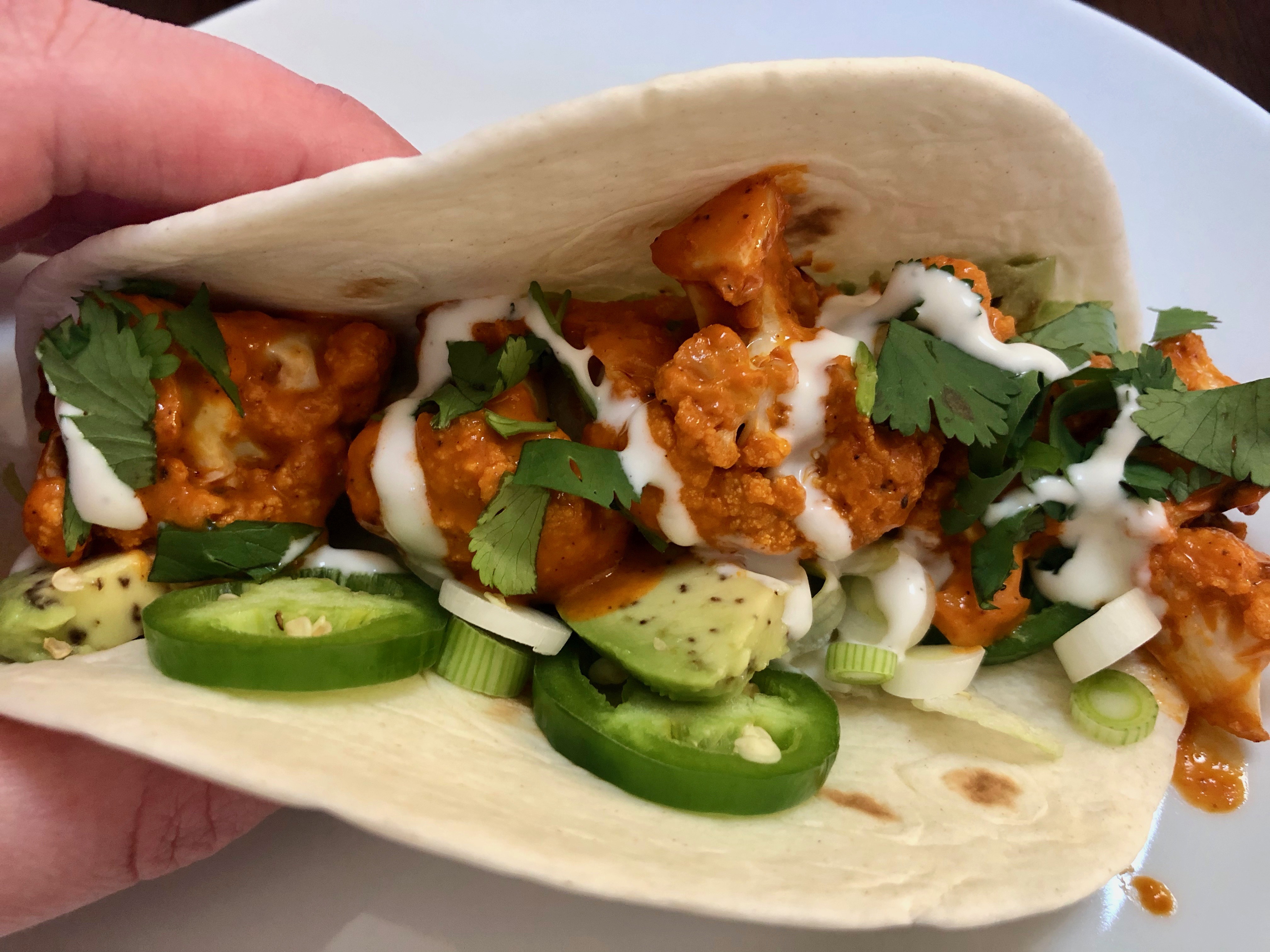 Assemble the tacos with lettuce, avocado, green onion, and cauliflower. Drizzle with a small amount of ranch.