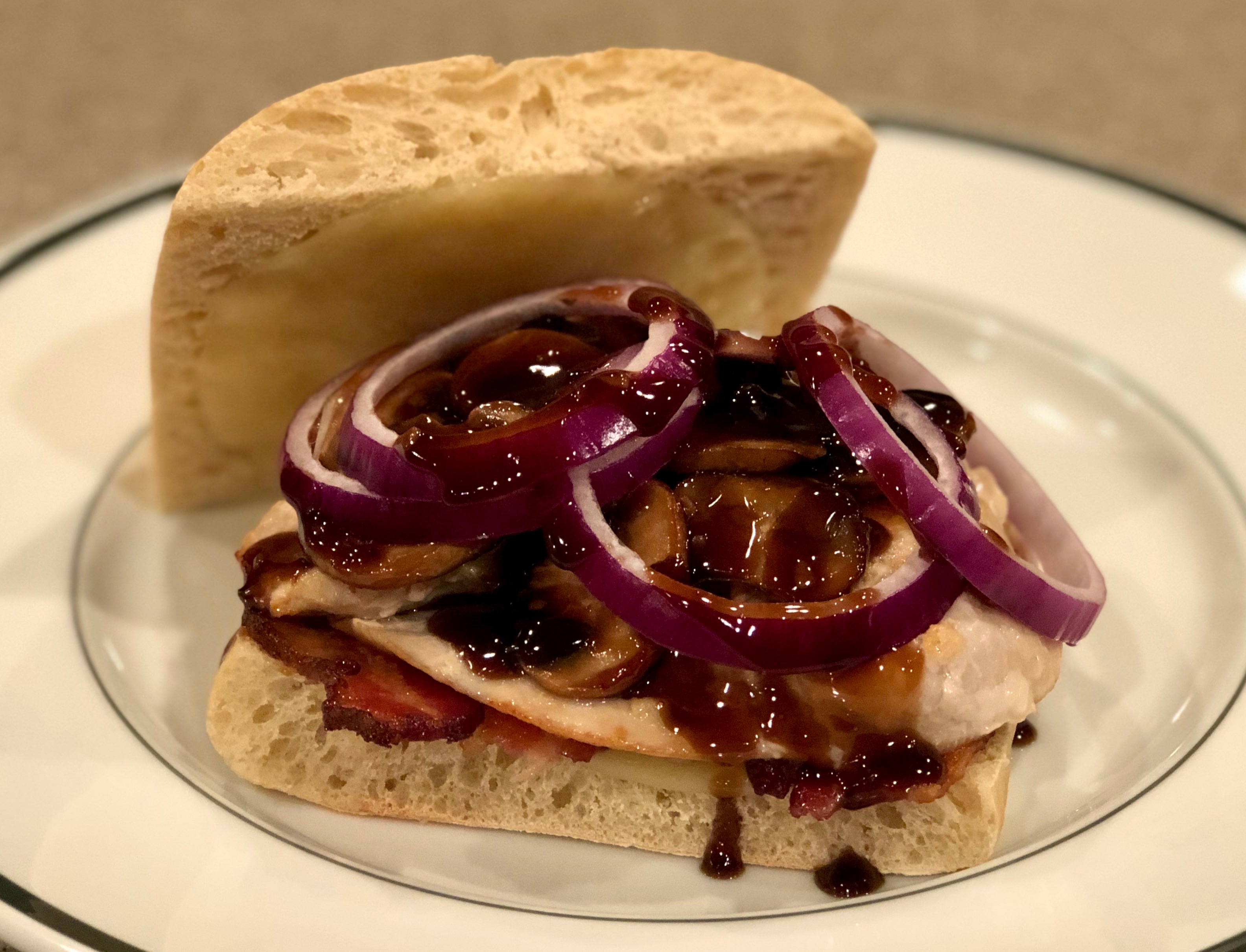 Assemble the sandwich. Cut the bacon in half and place half on the bottom of each sandwich (2 slices of bacon per sandwich). Top with a chicken breast. Then add a heaping scoop of the sautéed mushrooms. Top with a few pieces of onion and drizzle some of the Guinness Glaze on top. Then place the top half of the ciabatta on the sandwich and enjoy!