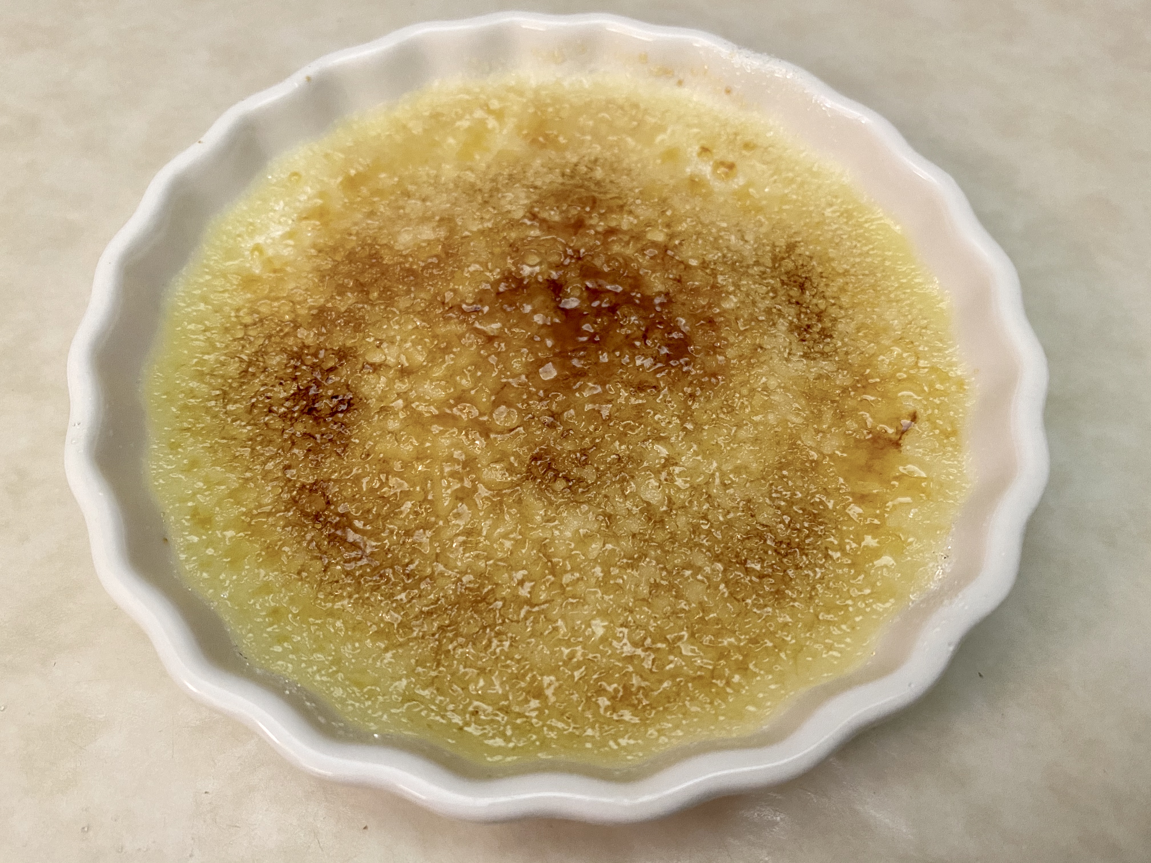 Before serving, sprinkle 1-2 Tbsp of sugar on top of each custard. Rotate the ramekin as you sprinkle the sugar to make sure the top is evenly coated. Ignite the torch and hold the flame about 4-inches from the surface of the sugar. Move your hand in a circular motion across the surface to melt the sugar. The sugar will start to bead, then solidify and form a hard crust, and start to caramelize. The end result will be a nice brown color.