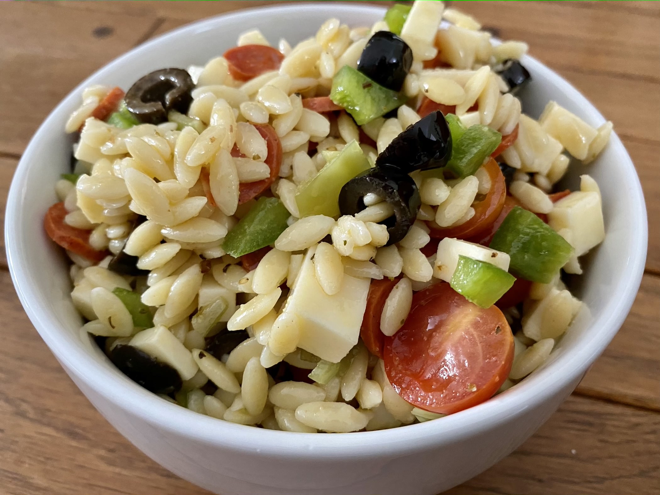 In a large mixing bowl, add the olives (drained), pepperoni, bell pepper, pepperoncini, tomatoes, and mozzarella cubes. Stir to combine. Add the cooked and cooled orzo and stir to combine.