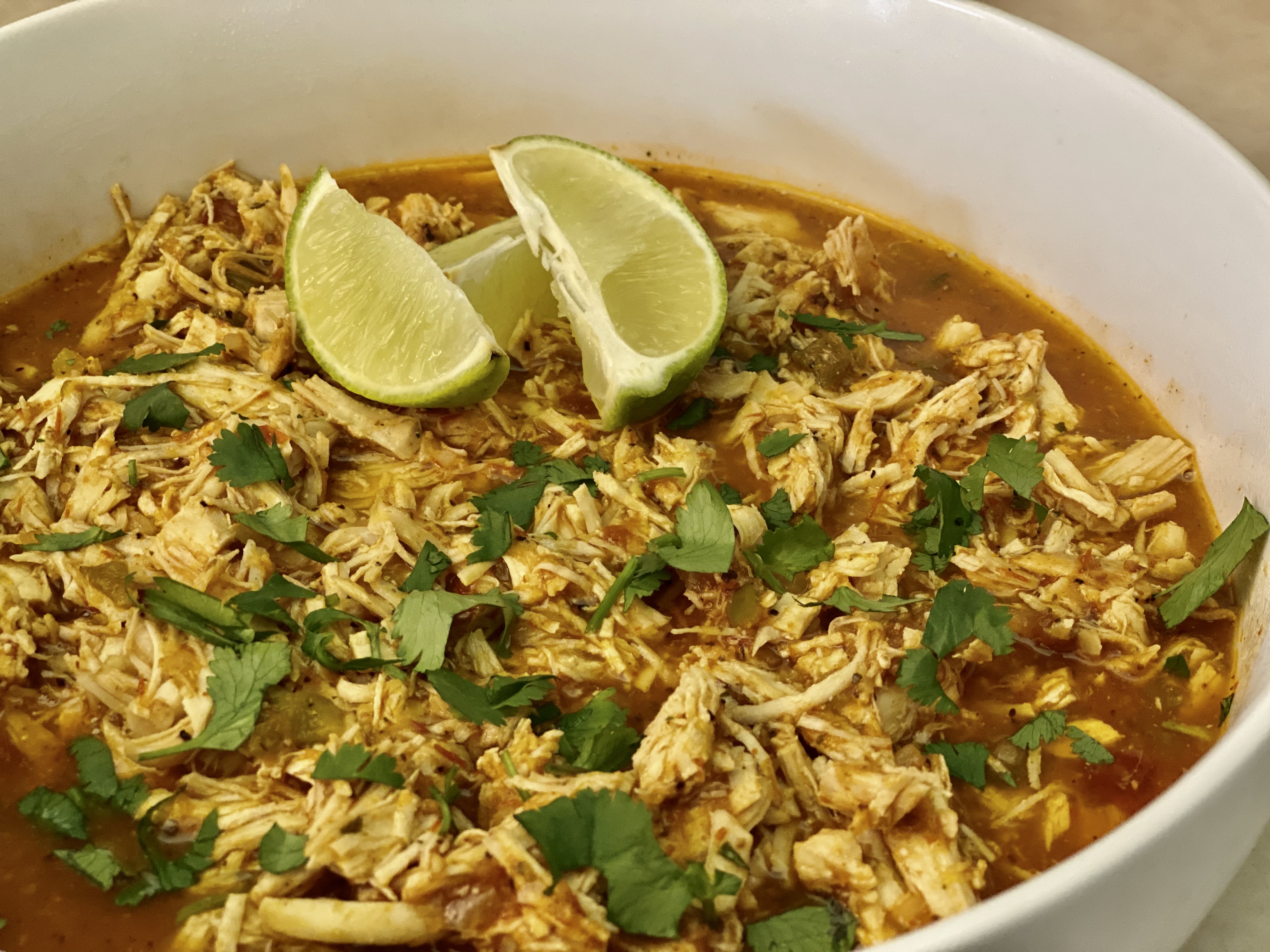 Turn the Instant Pot to the soup setting. Add the packet of taco seasoning and stir to combine. Bring to a simmer. Add the chicken back to the Instant Pot and stir to combine. Let the mixture warm and absorb for about 5 minutes, stirring occasionally.