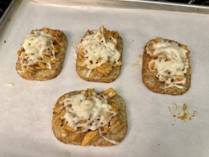 Evenly divide the buffalo mixture between the hashbrowns. Top with shredded mozzarella and return to the oven for a few minutes to melt the cheese.