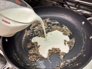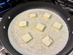 Use a large skillet to melt 1 Tbsp of butter over medium heat. Add the garlic and pepper and cook for 1-2 minutes then whisk in the cream.