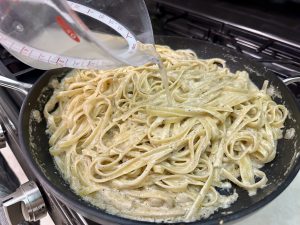 Add the reserved pasta water, about ¼ cup at a time, and stir to incorporate and thin out the sauce. If you like thicker sauce you can skip this step, otherwise keeping slowly adding pasta water until your desired sauce level is reached.